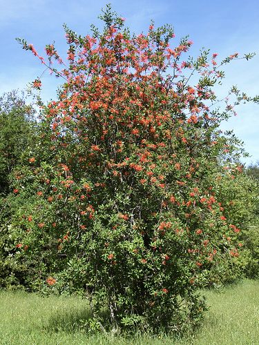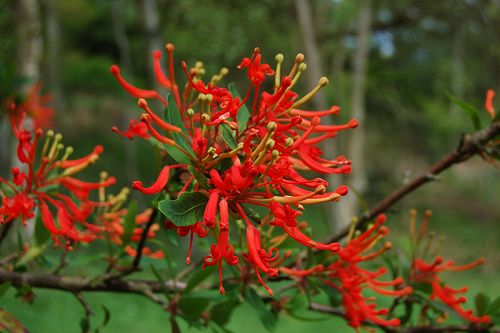 Название этого высокорослого кустарника с яркими, экзотического вида цветками может быть вам еще незнакомо. В конце весны-начале лета он цветет необычного вида цветками, собранными в соцветия диаметром до 10 см. Соцветий бывает так много, что куст кажется объятым пламенем. Цветок состоит из узкой трубки, из которой выступает наружу длинный пестик. Растение требовательно к условиям: ему нужен мощный слой плодородной, влагоемкой, неизвестковой почвы. Подобно ломоносу, оно любит притенение у корней, на открытых участках его лучше высаживать под прикрытием стены. Идеальные условия для роста — в лесистом саду. Практически не требует обрезки, ветви вырезают только при необходимости.