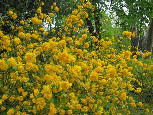 Керрия. Яркие золотисто – желтые цветки этого растения достигают в диаметре 5 сантиметров и расцветают на нежных побегах почти все лето. В условиях холодных российских зим лучше пригибать и укрывать эти растения, но, даже если этого не сделать, подмерзший кустарник легко восстановится. Почва предпочтительна влажная и плодородная. Высаживать кустарник стоит в безветренном и хорошо освещаемом солнечными лучами месте. Размножать растение можно черенками и делением куста.