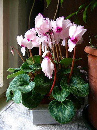 Цикламен одно из наиболее популярных цветущих зимой горшечных растений. Он поистине очарователен компактный, с красивыми, на длинных цветоносах цветками с декоративной, в серебристо зеленых узорах листвой. Цветки с отогнутыми назад лепестками ярких и пастельных тонов, крупные и бросающиеся в глазам или маленькие и душистые.