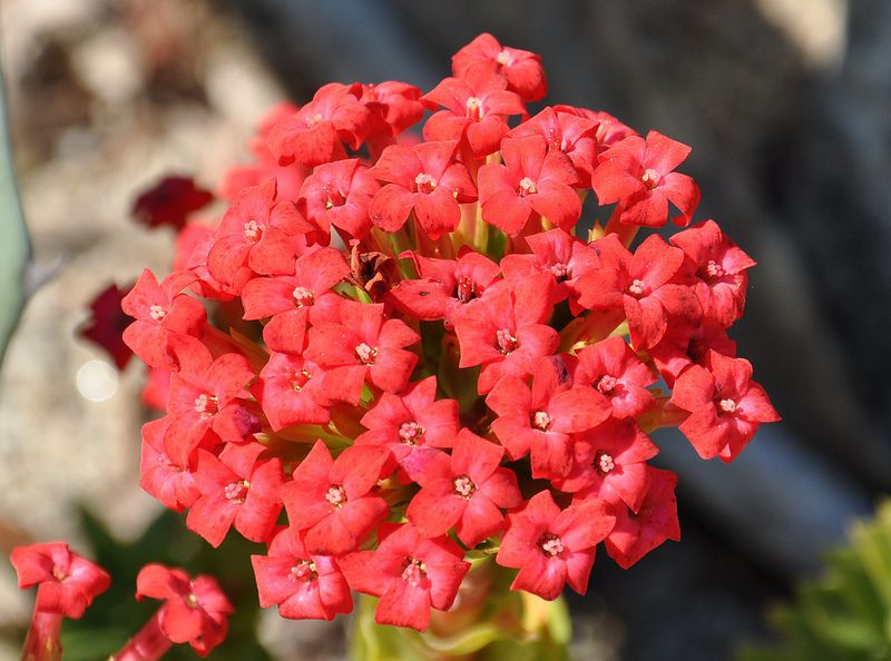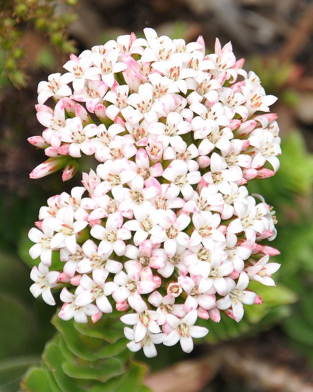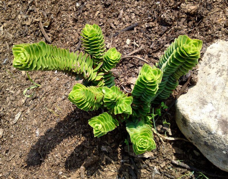 Это растение продают под названием крассула, но правильное его название - рошея. Стебли густо облиственны кожистыми треугольными листочками, летом появляются эффектные соцветия. Требования к уходу у рошеи такие же, как у всех суккулентных растений - хорошее освещение и обильный полив летом, свежий воздух в солнечную погоду. Важно обеспечить растению постоянный приток свежего воздуха.