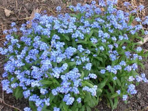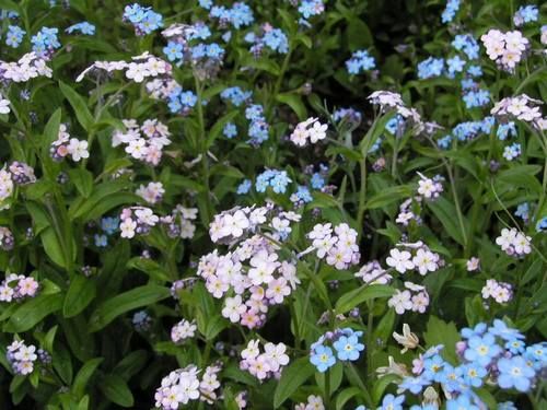 Карликовые двулетние незабудки традиционно высаживают между высокими тюльпанами или хейрантусом. Кроме низкорослых сортов с голубыми цветками есть высокорослые незабудки для бордюра, недолговечные многолетники для альпинария, а также розовые или белые сорта. У всех незабудок плотные соцветия мелких цветков. Незабудка — неприхотливое растение, ей нужны лишь хорошо дренированная почва и полив в сухую погоду. Имейте в виду, что незабудка легко обсеменяется.