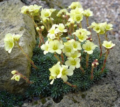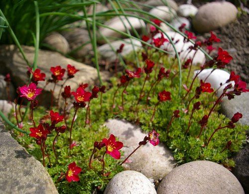 Виды и сорта: В бордюрную группу входят крупные и быстро разрастающиеся растения. Наиболее распространена К. городская (S. urbium) высотой 30 см, разрастающаяся до 45 см в ширину; цветет в мае-июле. Инкрустированные, или серебряные камнеломки цветут звездчатыми цветками в мае-июле; их листья покрыты частичками извести и образуют розетки. В эту группу входят К. вечноживучник (S. aizoon), или К. метельчатая (S. paniculate), цветущая метельчатыми соцветиями белых цветков, и К. ложковидная (S. cochlearis) высотой 20 см, цветущая гроздьями белых цветков на красных цветоносах; кустик разрастается до 25 см в диаметре. Вместо высокорослой К. котиледон (S. cotyledon) лучше посадить один из компактных гибридов — белый К. «Whitehill» или кремовый К. «Esther». Моховидные камнеломки образуют «мшистые» кочки, цветут в мае. Популярны гибриды К. «Hi-Ace» (розовый), К. «Pixie» (красно-розовый), К. «Cloth of Gold» (белый, листья золотые) и К. «Peter Pan» (розовый). Листья подушковидных камнеломок с частичками извести образуют низкие куртинки, цветут рано — в апреле. Популярна красивая белая К. Бурсера (S. burseriana) высотой 5 см, зацветающая сразу после схода снега. Желтые цветки К. заостренной (S. apiculata) появляются немного позже; высота 10 см. Популярны также гибриды К. «Jenkinsiae» (бледно-розовый) и К. «Cranbourne» (розовый).