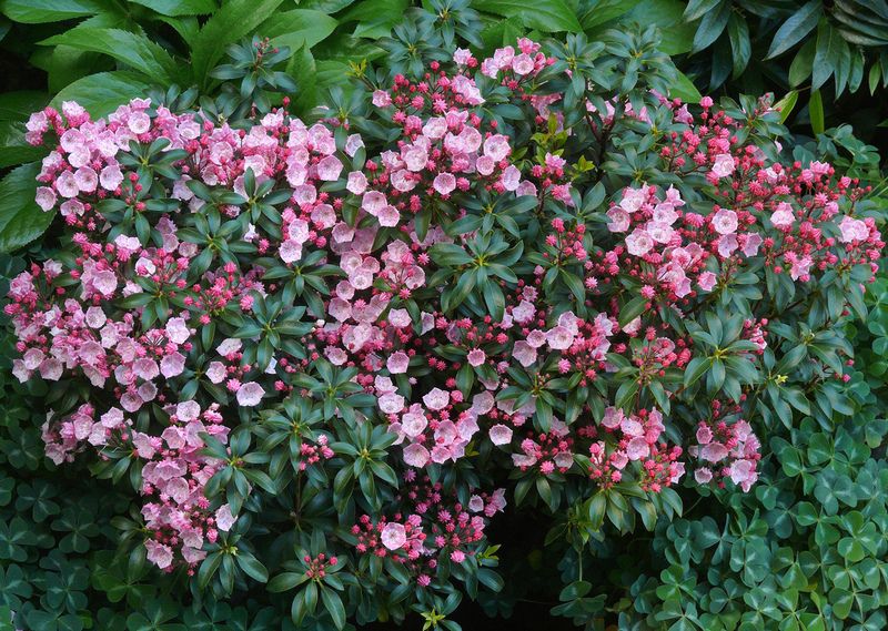 Виды и сорта: Широко распространенная К. широколистная (К. latifolia) вырастает до 2-2,5 м. В июне овальные блестящие листья почти не видны под 15-сантиметровыми шапками розовых цветков. Растение морозостойкое, но не выносит недостатка влаги. Почву над корнями весной мульчируют, увядшие соцветия удаляют. Заслуживают внимания сорта «Ostbo Red» с густо-розовыми и «Olympic Fire» с красными цветками. К. узколистная (К. angustifolia) «Rubra» вырастает до 1 м и похожа скорее на азалию, чем на рододендрон. Розовато-красные цветки распускаются на протяжении мая и июня. В апреле цветет карликовая (0,5 м) К. беловиколистная (К. polifolia), любящая болотистую почву.