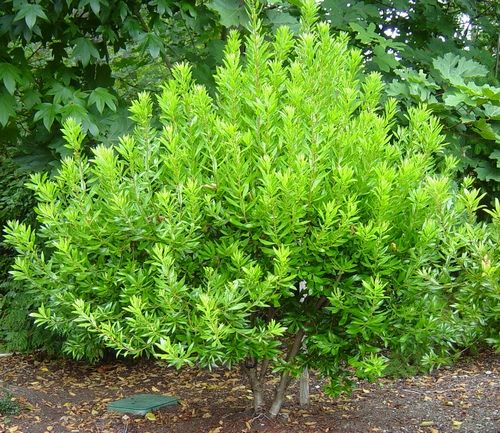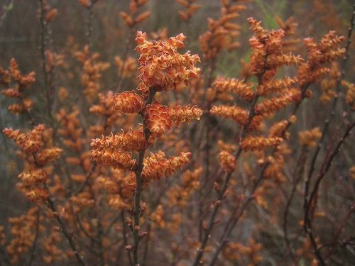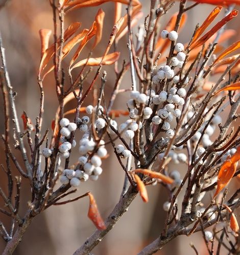 Необычное растение, во-первых, потому, что редко встречается, а во-вторых, потому, что два его вида любят болотистую почву, а другие два — сухую и бедную. Если на вашем участке обычная садовая земля, вам об этом растении лучше забыть. Внешне кустарник не представляет собой ничего особенного, цветет в апреле-мае небольшими коричневатыми сережками. Растение двудомное, так что для получения плодов, ради которых восковник и выращивают, нужно посадить рядом мужской и женский экземпляры. Тогда в конце осени вы сможете любоваться плотно сидящими на стеблях плодами. Обрезать растение не обязательно.