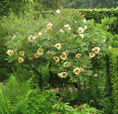 Виды и сорта: У П. полукустарникового (P. suffruticosa) высотой до 2 м чашевидные цветки диаметром до 15 см. Сорта: «Rock's Variety» (немахровый, бледно-розовый), «Higurashi» (полумахровый, малиновый) или «Hodai» (махровый, розово-красный). У разновидности ludlowii П. желтого (P. lutea ludlowii) блюдцевидные цветки золотисто-желтые. Очень крупные желтые цветки у П. Лемуана (P. lemoinei), например сорта «Alice Harding». Дающий корневую поросль П. Делавея (P. delavayi) высотой 1,5 м цветет немахровыми малиновыми цветками. У него очень декоративные листья.