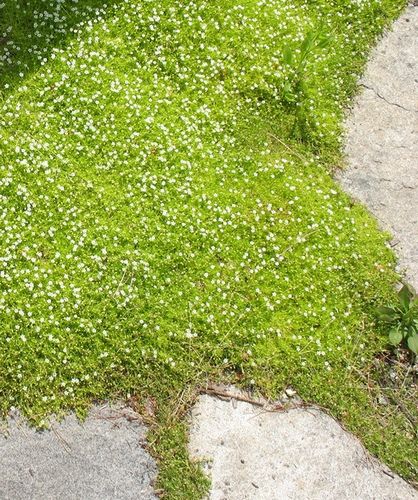 Предпочитает ласкать ваши ноги мшанка шилолистная. Внешне она ничем практически не отличается от обычной газонной травы или мха, только вот очень любит, чтобы по ней ходили. И чем больше по ней ходят, тем она красивее, зеленее и пышнее, хотя рост ее всего 3-5 сантиметров. Листья у нее узкие и, как вы уже догадались, шиловидные. Очень уж она солнышко любит, и как только оно выглядывает, дорожки, поросшие мшанкой шилолистной, мгновенно покрываются маленькими белыми звездочками-цветами. А так как листья у этого растения могут быть еще и желтыми, то ваш зелено-желтый коврик в белых звездочках, просто манит по нему прогуляться.