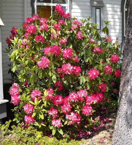 Виды и сорта: Наиболее популярны крупноцветковые гибриды. Основную группу составляют морозостойкие гибриды, славящиеся выносливостью и отлично чувствующие себя на открытых участках. В XX в появилось множество других гибридов, зачастую более красочных, но несколько более нежных. Высота куста, как правило, составляет от 1,5 м до 2,5 м. Цветение, в зависимости от сорта, приходится на апрель-июль. Ниже перечислены лишь немногие из популярных сортов, на самом деле их гораздо больше. Заслуживают внимания сорта «Betty Wormald» (крупные густо-розовые цветки в мае-июне), «Britannia» (малиновые цветки в мае-июне), «Cunningham's White» (белые с бледно-лиловыми пятнами цветки в мае-июне), «Cynthia» (малиновые с темным пятнами цветки в мае-июне), «Doncaster» (алые с темными пятнами цветки в мае-июне), «Fastuosum Flore Pleno» (полумахровые розовато-лиловые цветки в мае-июне), «Goldsworth Orange» (розовато-оранжевые цветки в июле), «John Walter» (вишневые цветки в июле), «Lord Roberts» (темно-малиновые цветки в июне), «MrsG. W. Leak» (розовые с темными пятнами цветки в мае-июне), «Pink Pearl» (розовые с белой каймой цветки в мае-июне, очень популярен), «Purple Splendour» (темно-лиловые цветки в июне) и «Sappho» (белые с лиловой серединкой цветки в мае-июне). Владельцы небольших садиков все чаще отдают предпочтение карликовым гибридам. Их кустики высотой всего 0,5-1 м обильно цветут кистями небольших цветков в апреле-мае. Наибольшей популярностью пользуется сорт «Elizabeth» с красными цветками, но есть немало других, например, алый «Baden Baden», фиолетово-голубой «Blue Diamond», лавандовый «Blue Tit», розовый «Bow Bells», малиновый «Carmen», лавандово-розовый «Pink Drift», желтый «Princess Anne», рубиновый «Scarlet Wonder» и лимонно-желтый «Yellow Hammer». Необычны дикорастущие виды, такие как бледно-желтый Р. Макабе (R. macabeanum), похожий на деревце Р. древовидный (R. arboreum) с цветками различной окраски и Р. пятилистный (R. quinquefollum) с плоскими цветками. На основе Р. Якусимы (R. yakushimanum) высотой 1 м, розовые цветки которого постепенно бледнеют, выведен ряд замечательных низкорослых гибридов, таких как «Percy Wiseman», «Surrey Heath», а также белоснежные карликовые «Doc», «Grumpy», «Dopey» и др.