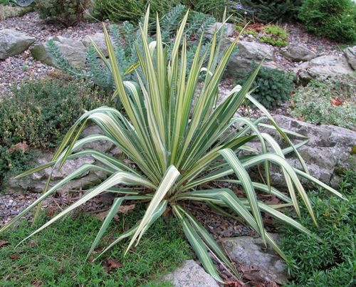 Виды и сорта: Обычно выращивают бесстебельные юкки. Наиболее распространена Ю. нитчатая (Y. filamentosa), образующая прикорневую розетку из жестких листьев длиной 60 см со спутанными волокнами по краю. Летом растение выбрасывает цветонос высотой 1,2-2 м, усыпанный кремовыми цветками. У сорта «Bright Edge« листья с желтой каймой, у «Variegata« — с желтой каймой и полосками. У Ю. повислой (Y. flaccida) листья повисают; высота цветоноса 60 см-1,2 м. У сорта «Golden Sword« листья в желтую полоску. Будьте осторожны с Ю. славной (Y. gloriosa) — у нее очень острые концы листьев. У гигантской Ю. Уиппла (Y. whipplei) лиловые по краям цветки сидят на цветоносах высотой 2-3 м. Из стебельных видов наиболее вынослива и распространена Ю. сизая (Y. glauca).