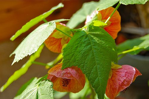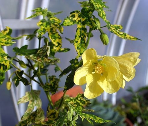 Типичный абутилон, или комнатный клен о6ильно ветвящийся кустарник с крупными пальчатораздельными листьями и свисающими на длинных цветоножках цветкам, появляющимся летом и осенью. Этому растению нужно много места - идеально подойдет большое, слегка притененное окно. Листья часто пестрые, с белыми или желтыми пятнами, некоторые разновидности выращивают как преимущественно декоративнолистные комнатные растения, которые, кроме того, порадуют вас летом цветками.