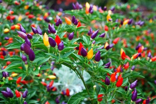 Виды и сорта: Существует много сортов П. однолетнего или П. стручкового (С. annuum). Которые в магазинах обычно не различают. У некоторых плоды круглые, хотя наибольшей популярностью пользуются виды с конусовидными плодами. Плоды от 2,5 см (Christmas Greeting) до 5 см (Fiesta) длиной, обычно меняют окраску с зеленой на желтую, а затем на красную. Некоторые сорта имеют фиолетовые плоды (например, Variegated Flash), у других плоды появляются летом. Стручковый перец - результат скрещивания чилийского и кайенского перцев, его жгучие декоративные плоды не предназначены для еды (тем не менее, с успехом потребляются. От автора сайта).