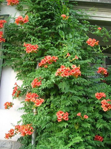 Виды и сорта: Наиболее мощные растения у К. крупноцветкового (С. grandiflora), или китайского (С. sinensis). Его тонкие побеги вырастают до 6 м в высоту и нуждаются в надежной опоре. Листья состоят из семи и более листочков. Красные с золотом цветки длиной 5-8 см собраны в поникающие на концах молодых стеблей соцветия. Другой выращиваемый в садах вид — К. укореняющийся (С. radicans) — более морозостоек, не такой сильнорослый и подобно плющу сам карабкается по опоре при помощи воздушных корней. Пока растение как следует не закрепится, побеги подвязывают к опоре. Цветки красные с золотом, у сорта «Elava» — желтые. У гибрида двух этих видов — К. таглибуанского (С. tagliabuana) «Madame Galen» — цветки красные с нежно-розовым.