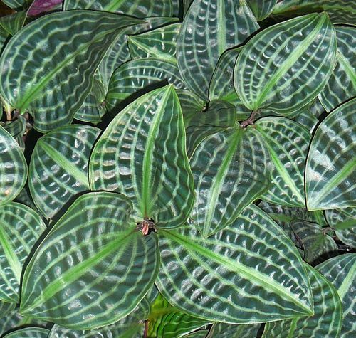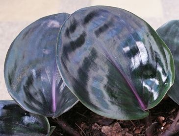 Геогенантус цветет летом розовато-лиловыми цветками с волнистыми лепестками, но выращивают его не ради быстро увядающих цветков, а ради необычных листьев с продольными складками, идущими от черешка к кончику листа. Геогенантус нелегко отыскать и трудно выращивать - ему нужны тепло и влажный воздух.