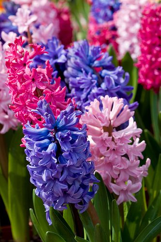 Виды и сорта: Наибольшей популярностью пользуются голландские гибриды Г. восточного (Н. orientalis). Они цветут в мае плотными соцветиями всевозможных оттенков, от белого до темно-лилового. Восковые цветки длиной 2,5 см покрывают верхнюю половину цветоноса. Сорта включают «Amethyst» (ранний, сиреневый), «Amsterdam» (ранний, красный), «Anna Marie» (ранний, сиреневый), «Blue Magic» (средний, лиловато-голубой), «Carnegie» (поздний, белый), «City of Haarlem» (поздний, желтый), «Delft Blue» (средний, бледно-голубой), «Jan Bos» (ранний, красный), «Lady Derby» (средний, розовый), «Lord Balfour» (средний, бордовый), «L'lnnocence» (средний, белый), «Ostara» (средний, темно-голубой), «Pink Pearl» (ранний, розовый) и «Violet Pearl» (ранний, розовато-лиловый с серебристой каймой). У римских гиацинтов, к которым относится Г. восточный беловатый (Н. orientalis albulus), соцветия более рыхлые, чем у голландских гибридов, а окраска ограничивается белой, розовой и голубой. Цветут они раньше, но плохо зимуют. У третьей группы — многоцветковых гиацинтов — соцветия тоже рыхлые, а каждая луковица дает несколько цветоносов. Римские и многоцветковые гиацинты выращивают относительно редко.