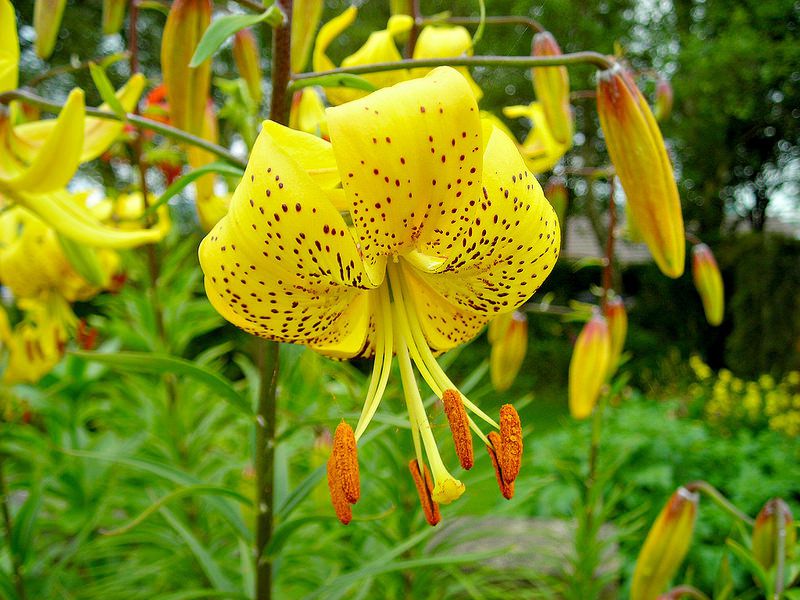 Л. Генри (L. henryi) Высота 1,8-2,4 м. Расстояние между растениями 45 см. Стеблекорневая. Цветки чалмовидные, желтые с темно-красными пятнами, до 8 см в диаметре. Цветет в августе-сентябре.