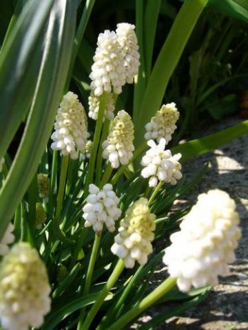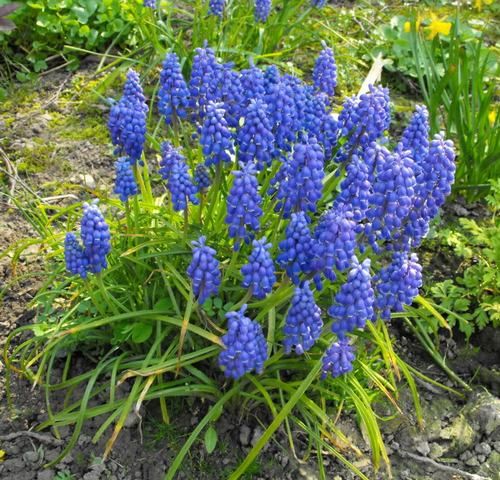 Виды и сорта: Наиболее распространен М. армянский (М. armeniacum) высотой 15-25 см, цветущий синими с белой каймой цветками длиной 0,5 см в апреле-мае. Луковицы сажают в сентябре-октябре на глубину 8 см и на расстоянии 10см. Листья остаются зелеными до увядания цветков. Сорта варьируют по высоте и окраске: махровый «Blue Spike» ниже ростом, у «Fantasy Creation» цветки серовато-синие. М. лазоревый (М. azureum) с ярко-голубыми цветками с темными полосками, у него есть белый карликовый сорт «Album». M. гроздевидный (М. botryoides) «Album» — еще один белоцветковый сорт. Несколько необычно для мускари выглядят М. хохолковый (М. comosum) «Plumosum» (30 см) с пышными фиолетовыми соцветиями, М. крупноплодный (М. macrocarpum) с желтыми с коричневой каймой цветками и М. амброзиевый (М. ambrosiacum), пурпурные цветки которого постепенно бледнеют и становятся сначала зеленоватыми, а затем кремовыми. Все перечисленные Виды и сорта цветут в мае. У М. Тубергена (М. tubergenianum) в верхней части соцветия бледно-, а в нижней — темно-синие цветки.
