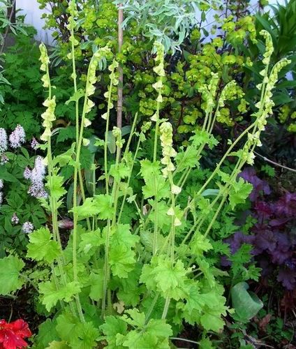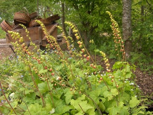 У теллимы, как и у ее родственницы тиареллы, пальчатолопастные зимующие листья с ярко выраженными жилками. В отличие от тиареллы, у которой белые звездчатые цветки, теллима цветет зеленоватыми колокольчатыми цветками. Это замечательное почвопокровное растение можно выращивать на переднем плане бордюра, оно лучше многих других садовых многолетников переносит засуху.