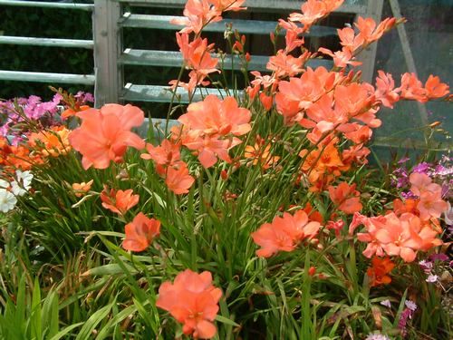 У тритонии такие же, как у ее родственниц крокосмии и иксии, ремневидные листья и тонкие цветоносы с ярко окрашенными звездчатыми цветками. Это еще менее выносливое растение, чем крокосмия, в открытом грунте его можно выращивать только в районах с мягким климатом. Клубнелуковицы высаживают в сентябре на глубину 5 см, на зиму почву над посадками мульчируют, в начале весны мульчу снимают.