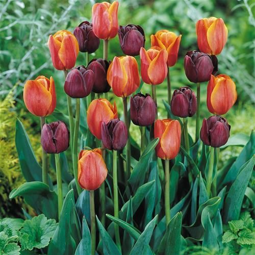 Несмотря на то что тюльпаны выращивают реже, чем нарциссы, из всех луковичных растений именно тюльпаны остаются вне конкуренции как источник разнообразных — как приглушенных, так и ярких — красок в саду весной. Есть сотни сортов тюльпанов. Карликовые ботанические тюльпаны высотой не более 10 см цветут в самом начале весны, а достигающие 75 см в высоту Рембрандт — тюльпаны распускаются в середине мая. Столь же разнообразны тюльпаны по окраске цветков, которая варьирует от белой до почти черной. Окраска цветков у тюльпанов — особая и увлекательная тема. Среди растений с нормальной для данного сорта окраской попадаются экземпляры с так называемой «нарушенной» окраской цветков, у которых второй или третий цвет в окраске проявляется в виде сложного рисунка из полос, пятен или тонких линий. Подобную окраску вызывает вирус, и было время, когда растения с такой причудливой окраской цветков стоили баснословно дорого, но сейчас они вышли из моды.