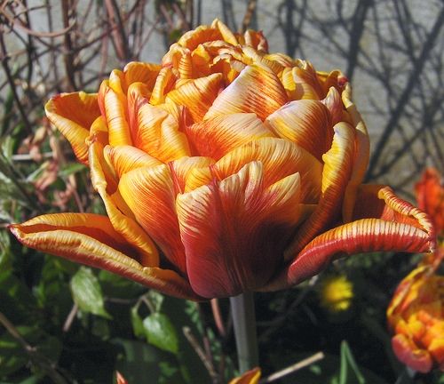 Махровые поздние тюльпаны: Цветки махровые, крупные и долго не увядающие. Цветут в конце весны. Высота 45-60 см. Цветоносы слабые, поэтому луковицы сажают ближе друг к другу, но чашевидным цветкам все-таки может потребоваться опора. Поздние махровые тюльпаны распространены гораздо меньше ранних. Некоторые каталоги предлагают сорта «Angelique» (бледно-розовый) и «Mount Tacoma» (белый); двуцветные сорта, такие как красные с желтой каймой «Bonanza» и «Allegretto» и оранжевый с желтой каймой «Orange Triumph», найти труднее.