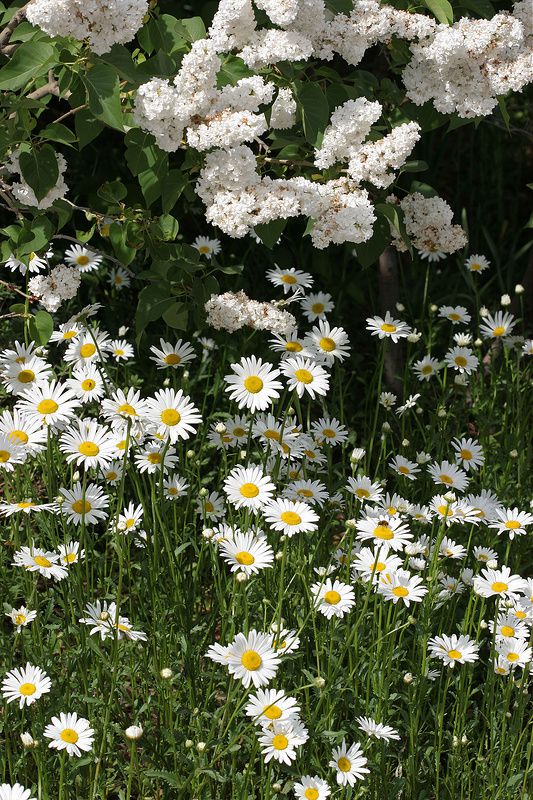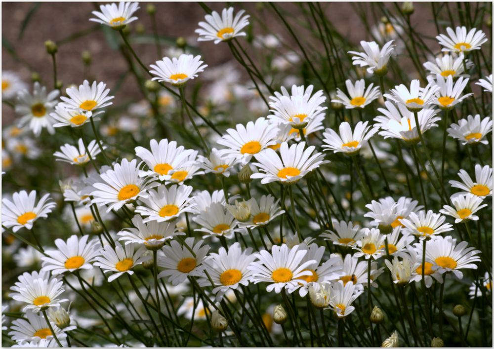 Крупные соцветия с белыми «лепестками» и желтой серединкой могут быть простыми, «полумахровыми» и «махровыми». Каждые два-три года кусты делят, в мае почву возле растений мульчируют, осенью стебли срезают на уровне земли.