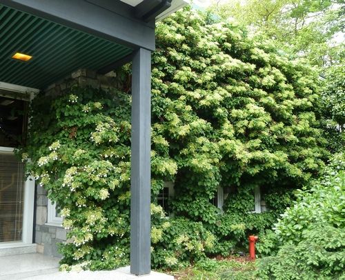 Помимо знакомой всем красивоцветущей кустарниковой гортензии есть также замечательная лиановидная гортензия. У нее глянцевые листья с мелкозубчатым краем, она бесстрашно взбирается по стенам и решеткам и со временем может закрыть площадь 20x20 м. Это очень мощное растение не сразу пускается в рост — в первые год-два оно может вас огорчать.