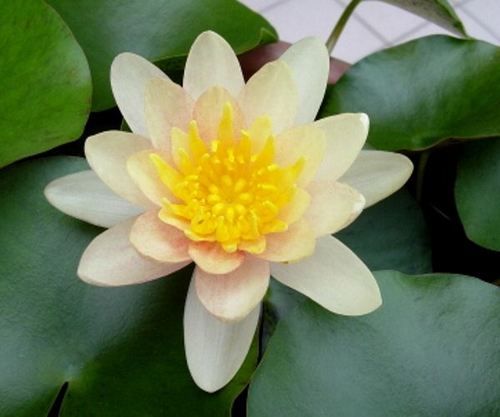 Кувшинка селекции Латур-Марлиака 1910 г. Расцветка цветока от желтого до абрикосового к центру, цветы стоят над поверхностью воды. Диаметр цветка 13-15 см. Листья овальные, темно-зеленый, обратная сторона с красно-коричневыми пятнами(мраморная), край листа чуть выше воды или немного изогнут, диаметр листа 18 см. Сорту нужно много солнца и теплой воды. Подходит для резервуаров и контейнеров на балконе или мини-прудов.