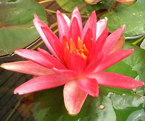 Кувшинка селекции Перри Д. Слокума 1989 г. Цветок ярко-красный, звездновидный, цветы находятся до 10 см над поверхностью воды, 14-16 см в диаметре. Листья круглые, широкие, почти квадратные, темно-зеленые, кожистые, диаметр 15 см. Не очень обильно цветет, хорошо подходит для прудов.