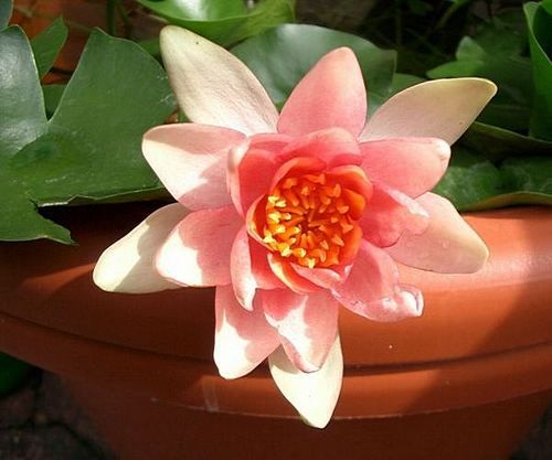 Кувшинка селекции Латур-Марлиака 1906 г. Цветок в середине медно-красный к краю розовый, со временем цветения светлеет, 6-8 см в диаметре. Листья овальные, верхняя и нижняя сторона серо-зеленого цвета, разрез стреловидный широкорасставленный, размер листа около 6-8 см. Растет медленно, требует много солнца, идеально подходит для водных мини-садов и мини-прудов, различных емкостей, легко переносит вынос из помещения на открытый воздух.