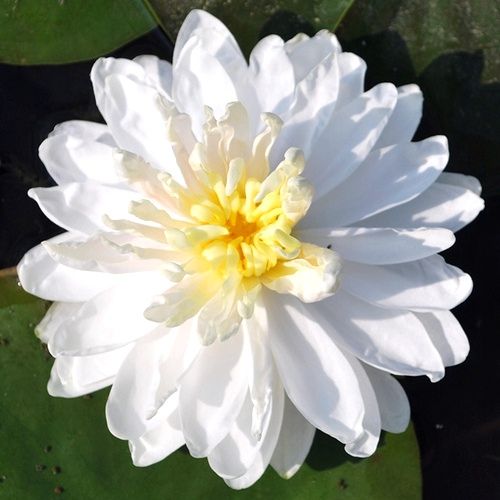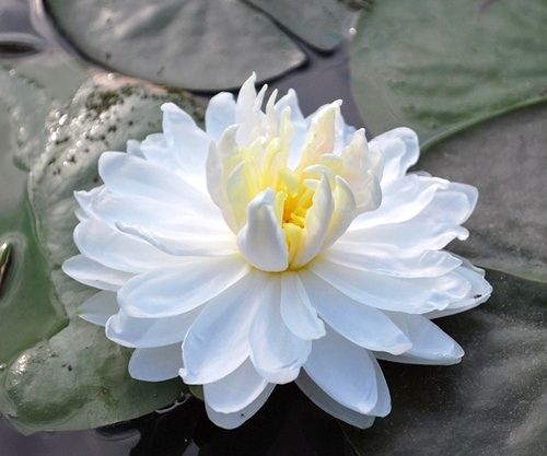 Кувшинка селекции питомника Перри Гарденс 1998 г. Цветок снежно-белый, очень густо-махровый, 14-16 см в диаметре. Листья овальные, вытянутые, от темно-зеленого до оливкового цвета, размер примерно 25x20 см. Редкий, но на мой взгляд, один из самых красивых белых сортов.