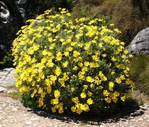 Этот представитель семейства сложноцветных родом из Южной Африки в последние годы завоевывает популярность, но распространенным еще не стал. Образует округлые кустики с привлекательными листьями, цветет желтыми соцветиями поздней весной. При благоприятных условиях роста соцветия могут покрывать весь кустик, но иногда цветение бывает слабым. Отцветшие соцветия удаляют, каждые несколько лет кустик сильно обрезают, чтобы он не разрастался.