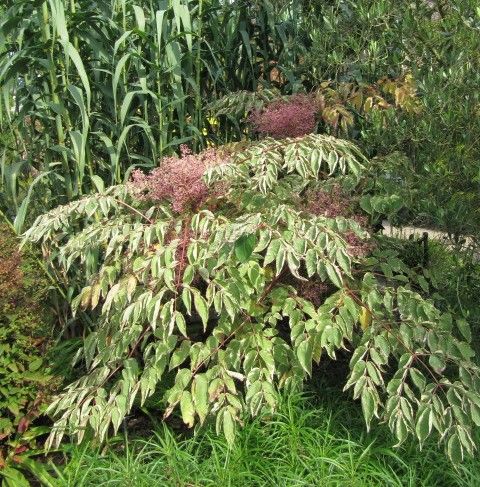 Виды и сорта: В продаже бывает почти исключительно А. высокая (A. elata). Ее выращивают главным образом ради декоративной листвы, хотя в конце мая она цветет крупными (до 60 см в высоту) рыхлыми метелками крошечных белых цветков. В благоприятных условиях эти эффектные соцветия могут полностью окутывать вершину куста. Есть два пестролистных сорта, оба они компактнее и несколько нежнее исходного вида. У сорта «Aureovariegata» листья с желтой, а у «Variegata» — с кремоватой каймой. К осени кайма у обоих сортов становится серебристо-белой. А колючая (A. spinosa) с колючими стволами цветет в июле.