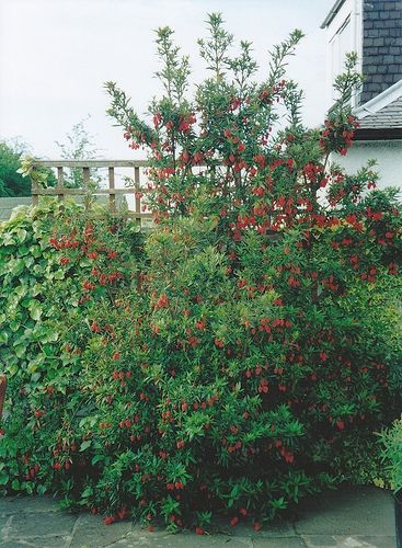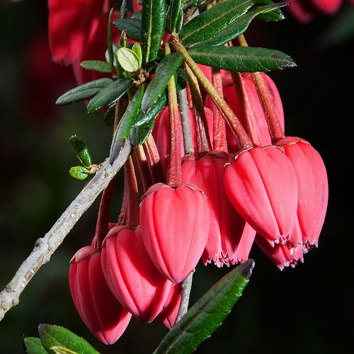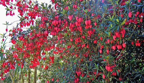 Эффектное теплолюбивое растение родом из Чили. Крупные цветки-фонарики, словно елочные украшения, свисают с ветвей на длинных цветоножках. Необычен у цветков не только внешний вид: бутоны формируются осенью, цветки раскрываются весной, а окрашиваются, в зависимости от вида, в начале или конце лета. Этому красавцу нужно тепло, защита от ветра и кислая, хорошо дренированная и влажная почва. Сухие и лишние ветви удаляют весной.