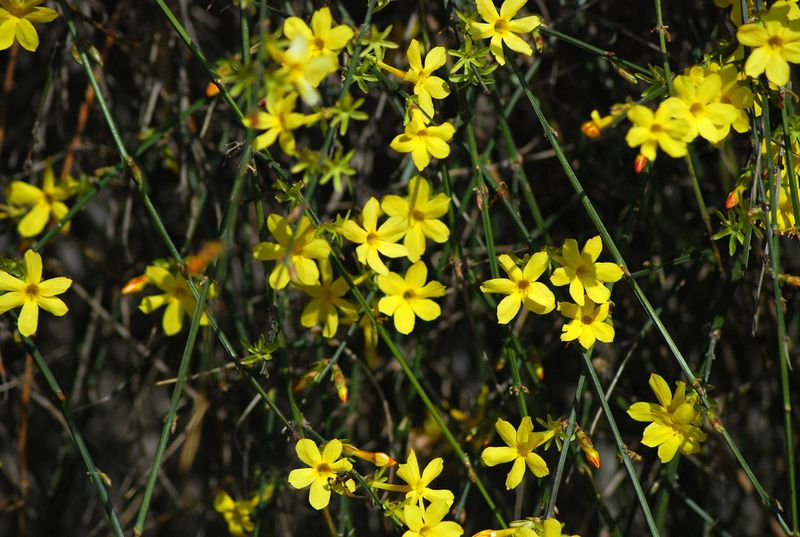 Характерные трубчатые цветки жасмина раскрываются в плоские звездочки. Цветки могут быть белыми, розовыми, желтыми или красными. Выделяют две основные группы жасминов: у кустарниковых жасминов зеленые стебли, мелкие листья и желтые цветки, вьющиеся жасмины растут как лианы. Обрезают жасмины так — кустарниковые, в марте отцветшие старые побеги обрезают на треть. Вьющимся обрезка не требуется.