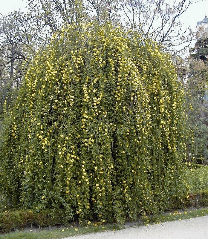 Виды и сорта: В районах с мягкой зимой желтые цветки Ж. голоцветкового (J. nudiflorum) распускаются на безлистных стеблях с ноября до февраля. Этот вид нетребователен и у стены вырастает до 3 м и выше. Ж. низкий (J. humile) «Revolutum» (2 м) цветет в июне слабо пахнущими желтыми цветками. Самый маленький в кустарниковой группе Ж. Паркера (J. parkeri) с мелкими листьями образует холмики высотой 30 см и цветет все лето крошечными желтыми цветками. Из красивых, но нежных вьющихся жасминов собенно хорош Ж. лекарственный (J. officinale) «Grandiflorum». В июне-сентябре его розовые бутоны раскрываются в белые, очень ароматные цветки. Побеги достигают длины 8 м и могут быстро укутать перголу или старое дерево. К вьющимся относятся также Ж. биизианский (J. beesianum) с красными цветками летом и черными ягодами зимой, нежный Ж. первоцветный (J. primulinum), цветущий в апреле-мае полумахровыми желтыми цветками, и Ж. Стефана (J. stephanense) с нежно-розовыми цветками. Из крупных лиан наиболее надежен весеннецветущий полумахровыми цветами Ж. Месни (J. mesnyi).