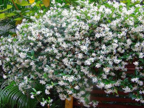 Виды и сорта: Наиболее вынослив и надежен Т. азиатский (Т. asiaticum). У него кремовые с желтой серединкой цветки с широко раскрытым венчиком диаметром около 2 см. Т. жасминовидный (Т. Jasminoides) украшает многие сады в южных штатах США. Цветки и листья у него крупнее, чем у Т. азиатского. Окраска цветков постепенно меняется с белой на кремовую. Это теплолюбивое растение часто вымерзает, поэтому его можно выращивать только в районах с еще более мягким климатом. У сорта «Variegatum» листья с кремовой каймой и пятнами, а у сорта «W776» («Wllsonll») — с выраженными жилками и зимой краснеют.