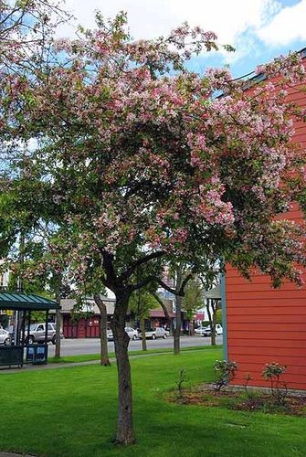 Яблоня и слива — самые популярные из цветущих деревьев; их белые и розовые цветки украшают сады ежегодно в апреле и мае. Чаще всего выращивают сливы, но стоит обратить внимание и на яблони. Есть сорта с красными цветками, которые хорошо растут на тяжелых почвах и приносят крупные и красивые яблоки, из которых можно варить варенье или делать сидр. Несколько советов: добавьте в почву перед посадкой торф или хорошо перепревший компост, подвяжите саженец к кольям и по необходимости опрыскивайте пестицидами. Поврежденные и искривленные ветви удаляют зимой.