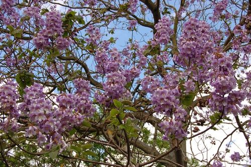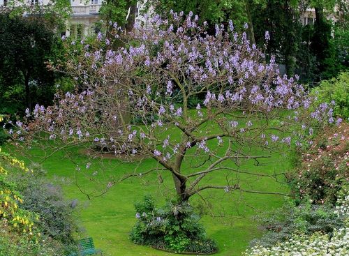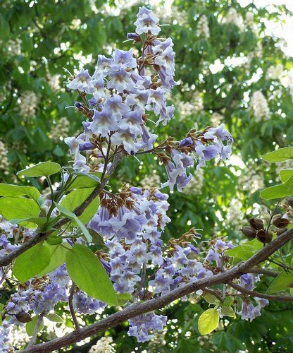 Цветущая взрослая павловния чрезвычайно эффектна. В мае над огромными листьями поднимаются кисти розово-сиреневых цветков, похожих на цветки наперстянки, что придает дереву необычный и экзотический вид. Выращивание павловнии похоже на азартную игру с природой: она зацветает спустя много лет после посадки, а бутоны могут побить заморозки. Не нуждается в специальной обрезке, но при выращивании в виде нецветущего кустарника ежегодно в марте обрезают на уровне земли.