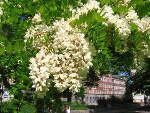В июне на робинии появляются поникающие кисти душистых цветков, похожих на цветки гороха, однако выращивают ее ради изящной формы кроны и красивой листвы. Робиния, или белая акация, неприхотлива, прекрасно выглядит в со-литерной посадке, но ее следует защищать от ветра, потому что у нее хрупкие ветви. Отмершие или поврежденные ветви вырезают летом (не весной и не зимой!).