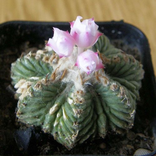 Небольшие складчато морщинистые стебли этого кактуса с несколькими неровными ребрами почти лишены колючек - из густого опушения на верхушке по мере роста постоянно появляются небольшие искривления колючки-коготки, которые вскоре усыхают и отваливаются. Сам стебель растет чрезвычайно медленно и одновременно как бы окаменевает в нижней части. В общем - настоящее живое ископаемое. Поразительно контрастируют со стеблем нежные крошечные бело-розовые цветки, регулярно в течении всего лета появляющиеся из верхушечного пуха. Обычно это растение выращивают в привитом виде, и на прививке оно оказывается не очень сложным в культуре и доступным начинающим. Ацтекиум имеет лишь коллекционную ценность - ни для озеленения подоконника, ни для включения в цветочные композиции он никак не подходит.