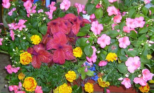 Чтобы цветник получился удачным важно рассаду сажать достаточно плотно, теснее, чем в обычной клумбе. Такая посадка помогает растениям противостоять порывам ветра, а плотная зелень защищает землю в вазонах от пересыхания.