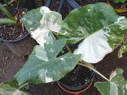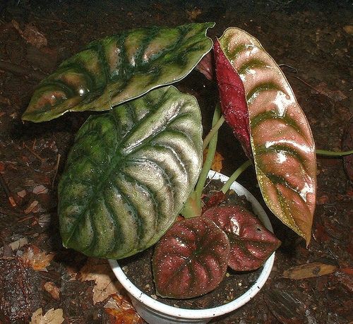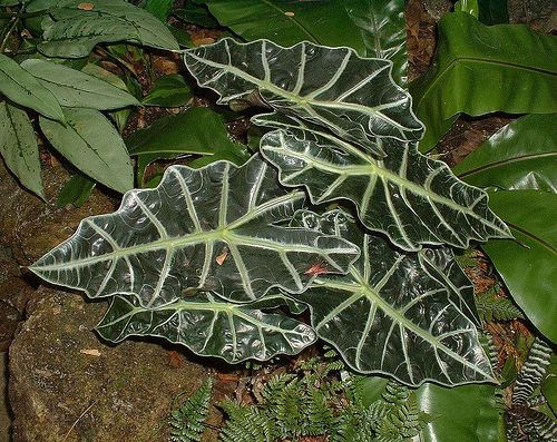 Виды и сорта: У А. Сандера (A. sanderiana) зеленые листья с металлическим отливом и зубчатыми краями. А. амазонская (A. amazonica) относительно более распространена, у нее более темные листья с резко выделяющимися яркими белыми прожилками. Очень красив сорт «African Mask». А. медная (A. cuprea) с темно-бордовыми молодыми листьями, а потом с такого же цвета обратной стороной листьев. Если Вам нужно декоративнолистное растение с крупными ярко-окрашенными листьями, приобретите А. крупнокорневищную (A. macrorrhizos) сорт «Albo Variegata».
