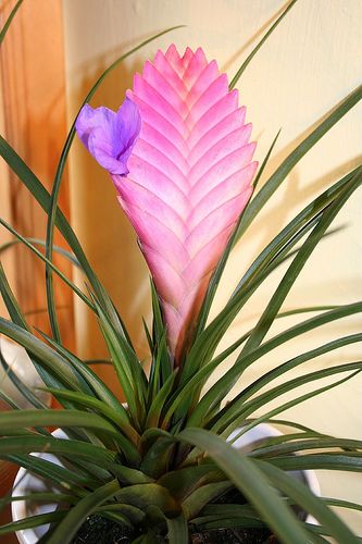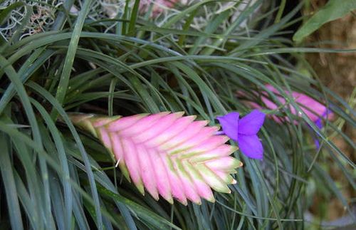 Виды и сорта: У двух наиболее распространенных видов тилландсии злаковидные листья, как у бильбергии, но цветки выглядят совсем иначе. У Т. Линдена (Т. Lindenii) длинные до 35 см злаковидные листья, уплощенное соцветие длиной 22-30 см, с розовыми прицветниками и фиолетовыми с белым зевом цветками. У синей (T. cyanea) более компактное соцветие с чисто фиолетовыми цветками.