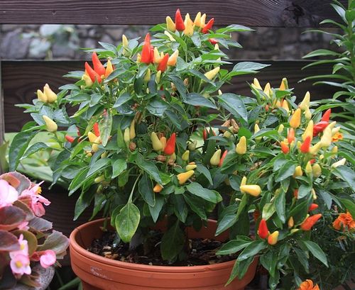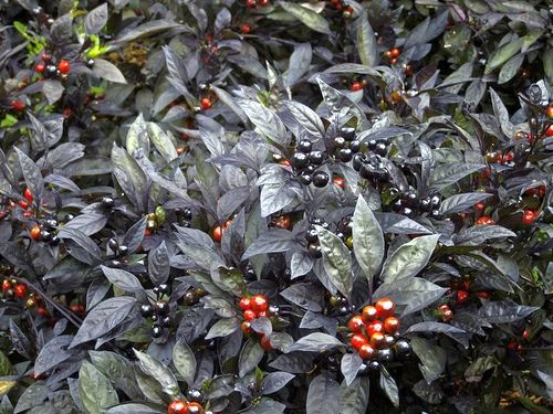 Виды и сорта: Существует много сортов П. однолетнего или П. стручкового (С. annuum). Которые в магазинах обычно не различают. У некоторых плоды круглые, хотя наибольшей популярностью пользуются виды с конусовидными плодами. Плоды от 2,5 см (Christmas Greeting) до 5 см (Fiesta) длиной, обычно меняют окраску с зеленой на желтую, а затем на красную. Некоторые сорта имеют фиолетовые плоды (например, Variegated Flash), у других плоды появляются летом. Стручковый перец - результат скрещивания чилийского и кайенского перцев, его жгучие декоративные плоды не предназначены для еды (тем не менее, с успехом потребляются. От автора сайта).