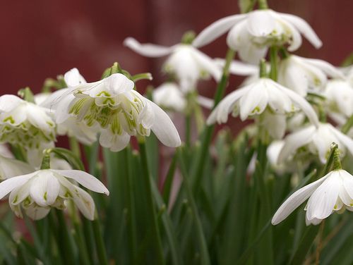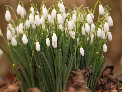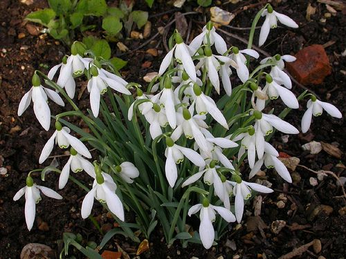 Мелкие белые колокольчики подснежника на цветоносах высотой 15 см расцветают в самом начале садового сезона. В отличие от цветущего примерно в то же время белоснежника, у подснежника три внешних чисто-белых «лепестка» и три внутренних «лепестка» с зелеными кончиками. Луковицы высаживают в сентябре или октябре сразу же после покупки.