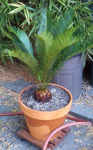 Весной и летом цикас нужно подкармливать любым органическим удобрением или специальным составом для пальм. Подкормка осуществляется раз в две недели. Молодые растения рекомендуется ежегодно пересаживать (точнее, переваливать) в больший по объему горшок. В дерновую почву положите немного древесного угля и керамзита для дренажа.