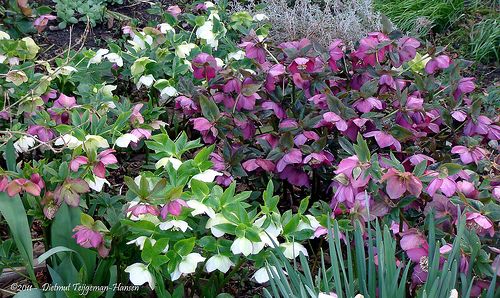 Крупные чашевидные цветки морозника могут быть белыми, зеленоватыми, розовыми или лиловыми. Зацветает рано весной и цветет около месяца. Крупные пальчаторассеченные листья прикрывают землю, цветки хорошо стоят в срезке. Морозник в целом неприхотлив. Перед посадкой в почву вносят компост, листовой перегной или торф, в засуху поливают, листья защищают от слизней. Нужно иметь в виду, что растение плохо переносит пересадку и деление, а все е
