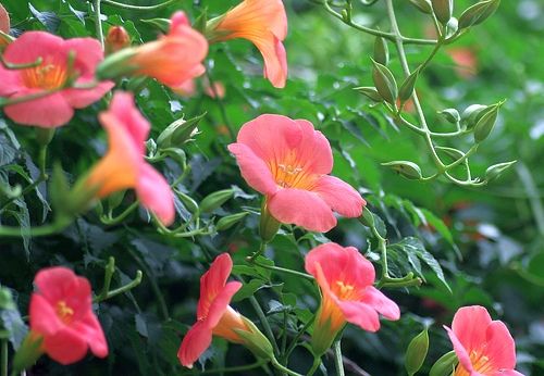 Виды и сорта: Наиболее мощные растения у К. крупноцветкового (С. grandiflora), или китайского (С. sinensis). Его тонкие побеги вырастают до 6 м в высоту и нуждаются в надежной опоре. Листья состоят из семи и более листочков. Красные с золотом цветки длиной 5-8 см собраны в поникающие на концах молодых стеблей соцветия. Другой выращиваемый в садах вид — К. укореняющийся (С. radicans) — более морозостоек, не такой сильнорослый и подобно плющу сам карабкается по опоре при помощи воздушных корней. Пока растение как следует не закрепится, побеги подвязывают к опоре. Цветки красные с золотом, у сорта «Elava» — желтые. У гибрида двух этих видов — К. таглибуанского (С. tagliabuana) «Madame Galen» — цветки красные с нежно-розовым.