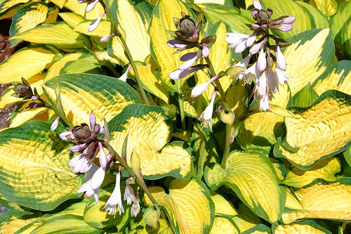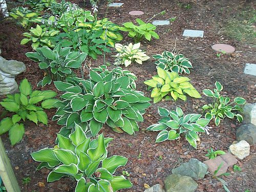 Виды и сорта: При покупке хосты обязательно прочитайте этикетку, так как взрослая листва может отличаться от молодой. Хосты бывают высотой от 15 до 90 см и цветут в июне-августе. В густой тени выращивают только цельнозеленые хосты, такие как X. «Royal Standard» (сердцевидные листья, белые цветки), X. вздутая — Н. ventricosa (сердцевидные листья, сиреневые цветки), X. Зибольда (Н. sieboldiana) «Elegans» (сердцевидные листья, белые цветки) или X. ланцетолистная — Н. lancifolia (ланцетные листья, лиловые цветки). Пестролистные и голубые сорта предпочитают полутень. Наиболее распространены X. Форчуна (Н. fortunei) «Albopicta» (кремовые листья с зеленой каймой) и «Aureomarginata» (зеленые листья с кремовой каймой), X. «Ground Master» (зеленые листья с белой каймой), X. «Halcyon» (голубые листья), X. «Blue Angel» (голубые листья), X. «Francee» (зеленые листья с белой каймой), X. «Wide Brim» (зеленые листья с кремовой каймой). Сортам с цельножелтыми листьями, таким как X. «Golden Prayers», X. «Piedmont Gold» и X. «Zounds», нужно солнечное место с некоторым притенением в полдень. Есть карликовые сорта для альпинария, например X. «Blue Moon» (10 см, голубые листья) и X. «Ginko Craig» (25 см, зеленые листья с белой каймой).