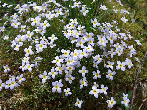 Необычное, выносливое, но редкое растение с зимующими листьями. Образует кустик или ковер из блестящих листьев длиной 1 см, с конца весны до начала осени покрытый цветками с четырьмя лепестками, сидящими на изящных цветоносах. В отличие от большинства других альпийских растений хустония предпочитает влажную почву и полутень.