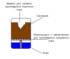 Если земли требуется много, то используется более трудоемкий способ. Земля пропаривается горячим паром на водяной бане в течение 2 – 3 часов, температура субстрата во время обработки не должна быть меньше 80 ºС. Для этого нужна специальная емкость (см. рисунок справа) или можно использовать не нужную соковарку, пароварку. На время обработки, емкость надо прикрывать крышкой, но не очень плотно. После обработки, почву надо немного остудить и лопаткой слоем до 10 – 15 см разложить по ровной чистой поверхности для просушки почвы.
